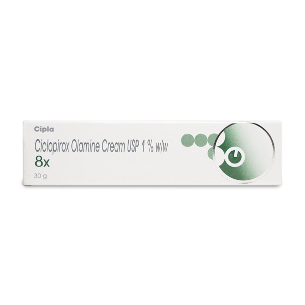 8X CREAM contains Ciclopirox, which belongs to the group of medicines called antifungals. It is indicated for the topical management of fungal skin infections like tinea pedis (infection of the feet causing an itchy, scaly rash), tinea cruris (fungal infection involving genital areas and the inner thigh and characterized by red, itchy, ring-shaped rashes), and tinea corporis (fungal infection of the trunk, arms, and legs).