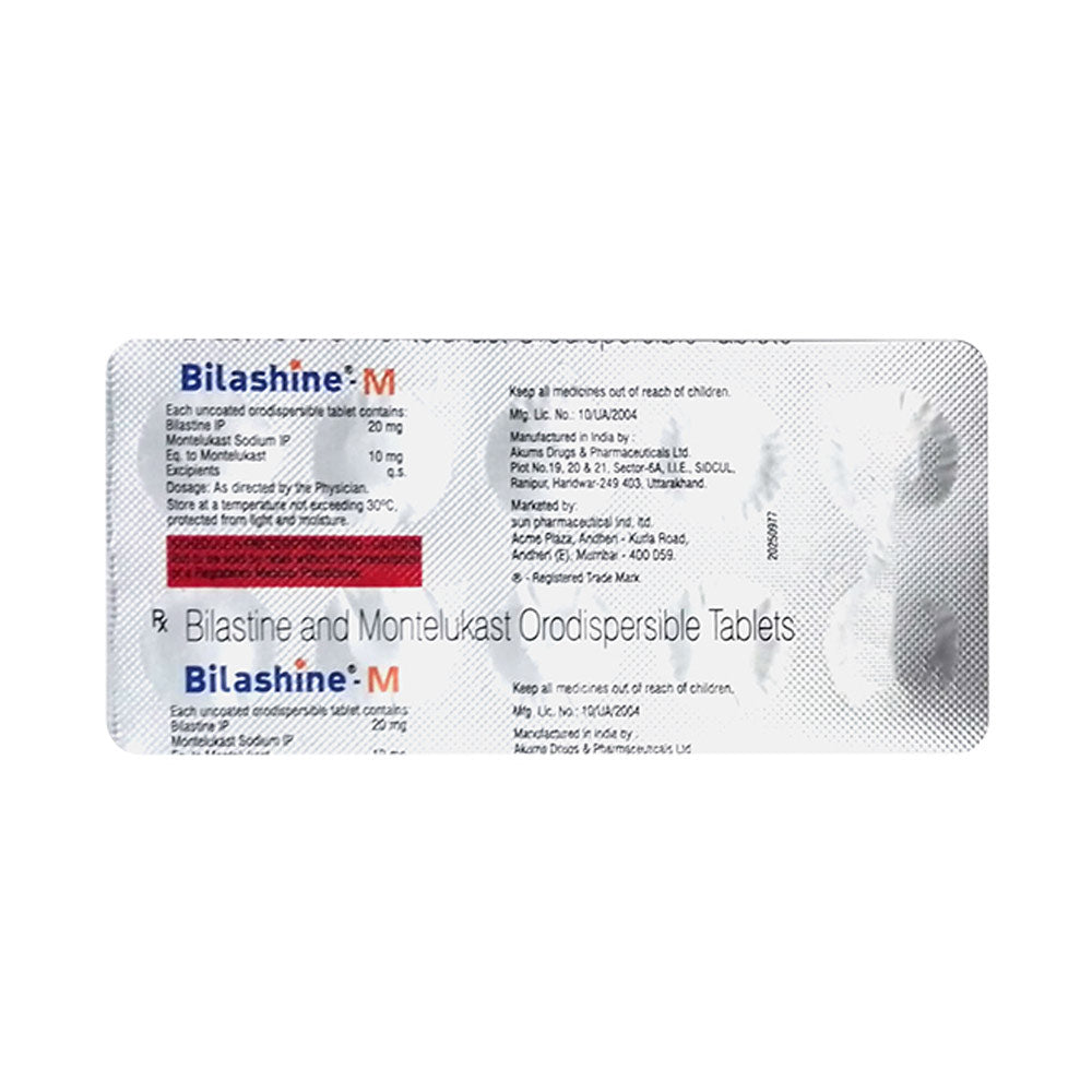 BILASHINE M ORODISPERSIBLE TABLET is a combination medication containing Bilastine and Montelukast. It is used to manage allergy symptoms such as runny nose, sneezing, and itchy eyes, as well as to reduce the symptoms of asthma.