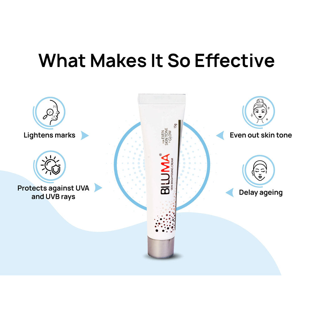 Biluma Skin Brightening Cream is a dermatologist-recommended formula that helps even out skin tone, reduce pigmentation, and restore a natural glow. Enriched with kojic acid dipalmitate, arbutin, licorice extract, and mulberry extract, it targets dark spots, melasma, and dullness. With added antioxidants like tocopheryl acetate and curcumin, it nourishes the skin while promoting radiance. Suitable for all skin types, Biluma cream provides visible results with regular use, making it an ideal choice for pigmentation correction and brightening skincare routines.