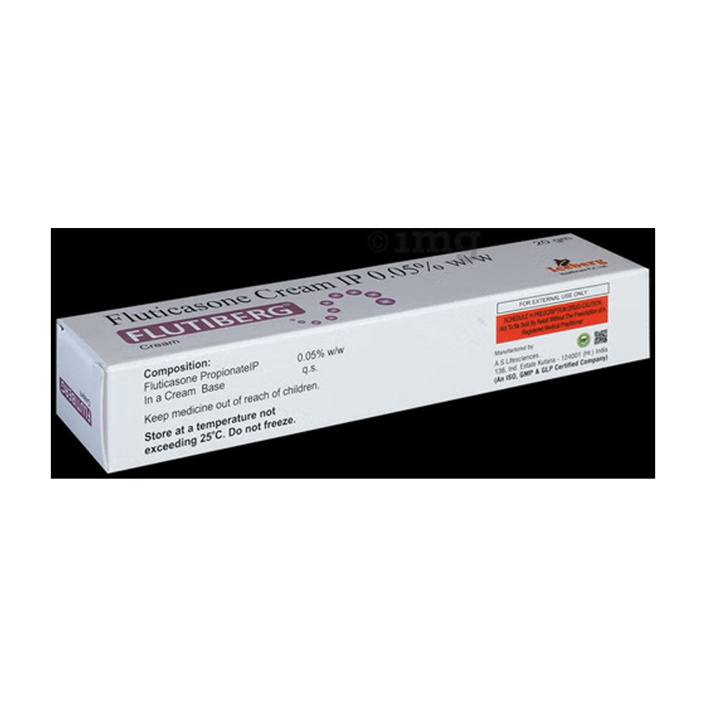 Flutiberg Cream belongs to a group of medicines called steroids. It is used for the treatment of skin conditions with inflammation and itching such as eczema, dermatitis, and psoriasis. It provides relief from pain, swelling, redness, and itching in several skin problems.Flutiberg Cream is only meant for external use and should be used as advised by your doctor. You should normally wash and dry the affected area before applying a thin layer of the medicine. Avoid any contact with your eyes, nose, or mouth. Rinse it off with plenty of water in case of accidental contact. Avoid covering the treated area with airtight dressings such as bandages unless directed by a doctor.