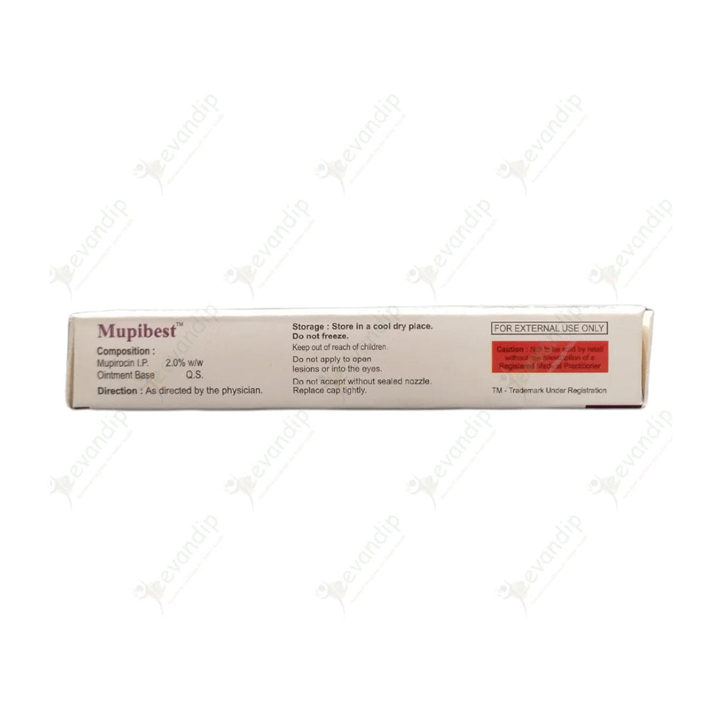 Mupibest 2% Ointment contains a potent topical antibiotic used for treating bacterial skin infections. It is commonly prescribed for conditions such as impetigo, infected cuts, and other localized skin infections caused by susceptible bacteria.