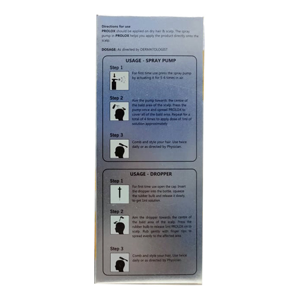 PROLOX 5% TOPICAL SOLUTION contains which belongs to the group of medicines called Vasodilators. It is used to manage hereditary hair loss (androgenic alopecia) on the head in men and women. PROLOX 5% TOPICAL SOLUTION is used to manage only mild to moderate hair loss problems, not complete hair loss and helps to stimulate hair growth in such cases.