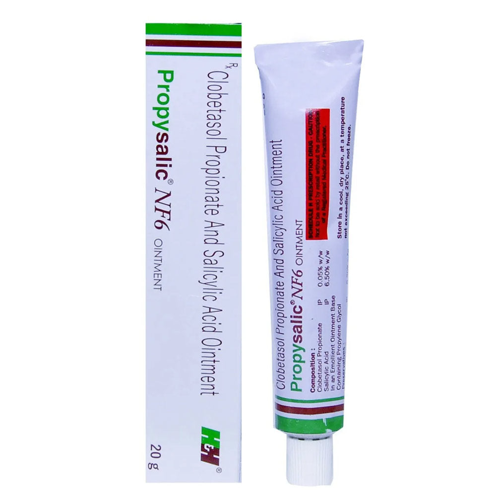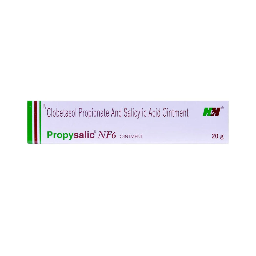 Propysalic NF6 Ointment is a combination of two medicines that are primarily used to treat eczema and psoriasis. Eczema is a condition in which skin patches become inflamed, itchy, cracked, and rough. Some types of eczema can also lead to blisters (a small bubble on the skin that is filled with serum and is caused by friction, burning, or other damage). Psoriasis is a skin disorder in which skin cells multiply up to 10 times faster than normal which leads to the build-up of skin into bumpy (uneven) red patches covered with white scales. These can grow anywhere, but most commonly they appear on the scalp, elbows, knees and lower back.