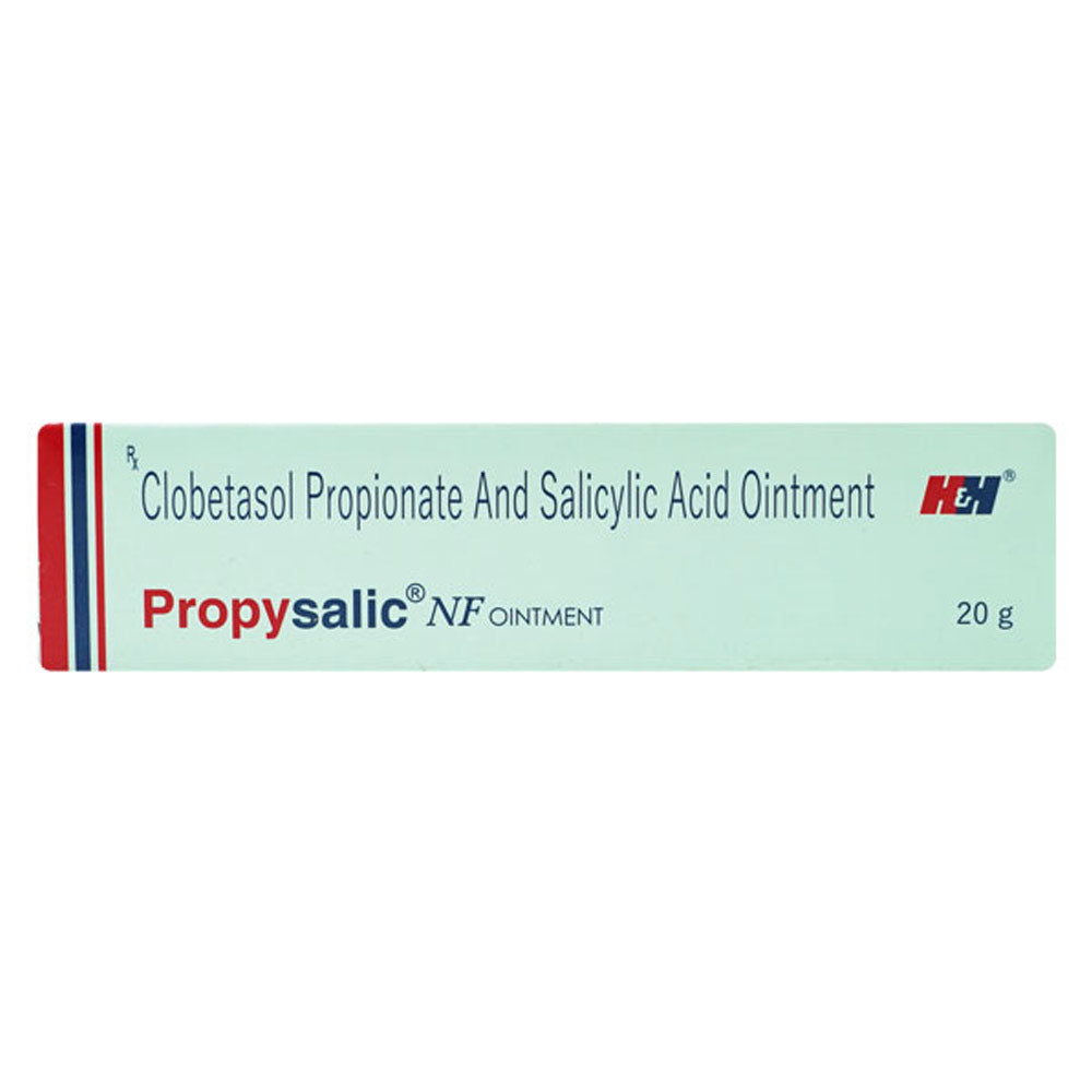 Propysalic NF Ointment is a medicine containing the active ingredients betamethasone and salicylic acid. It is commonly prescribed for dermatological conditions such as psoriasis, eczema, and other inflammatory skin conditions. Betamethasone, a corticosteroid, works by reducing inflammation, itching, and redness associated with skin conditions. It helps to relieve symptoms and promote healing. Salicylic acid, on the other hand, acts as a keratolytic agent, aiding in the removal of dead skin cells and reducing scaling. Propysalic NF Ointment is applied topically to the affected area(s) of the skin. It helps to control itching, inflammation, and scaling, resulting in relief from the symptoms of skin conditions. It is essential to follow the prescribed dosage and treatment duration for optimal results and to avoid any potential side effects.