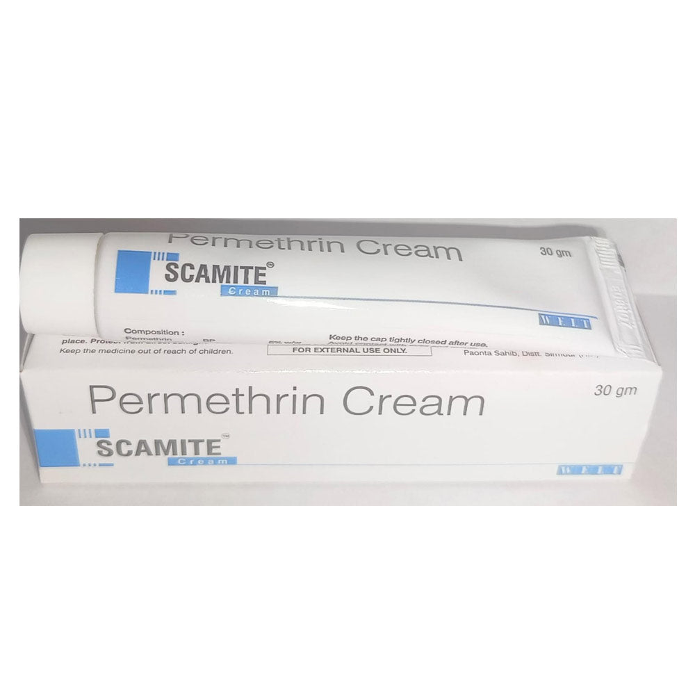 “Scamite Cream” appears to be a permethrin-based topical medication (5% concentration), commonly marketed under various brand names (such as Elimite, Acticin, Lyclear, or Scamith, in India) for treating scabies—the parasitic mite infestation causing intense itching and rash.