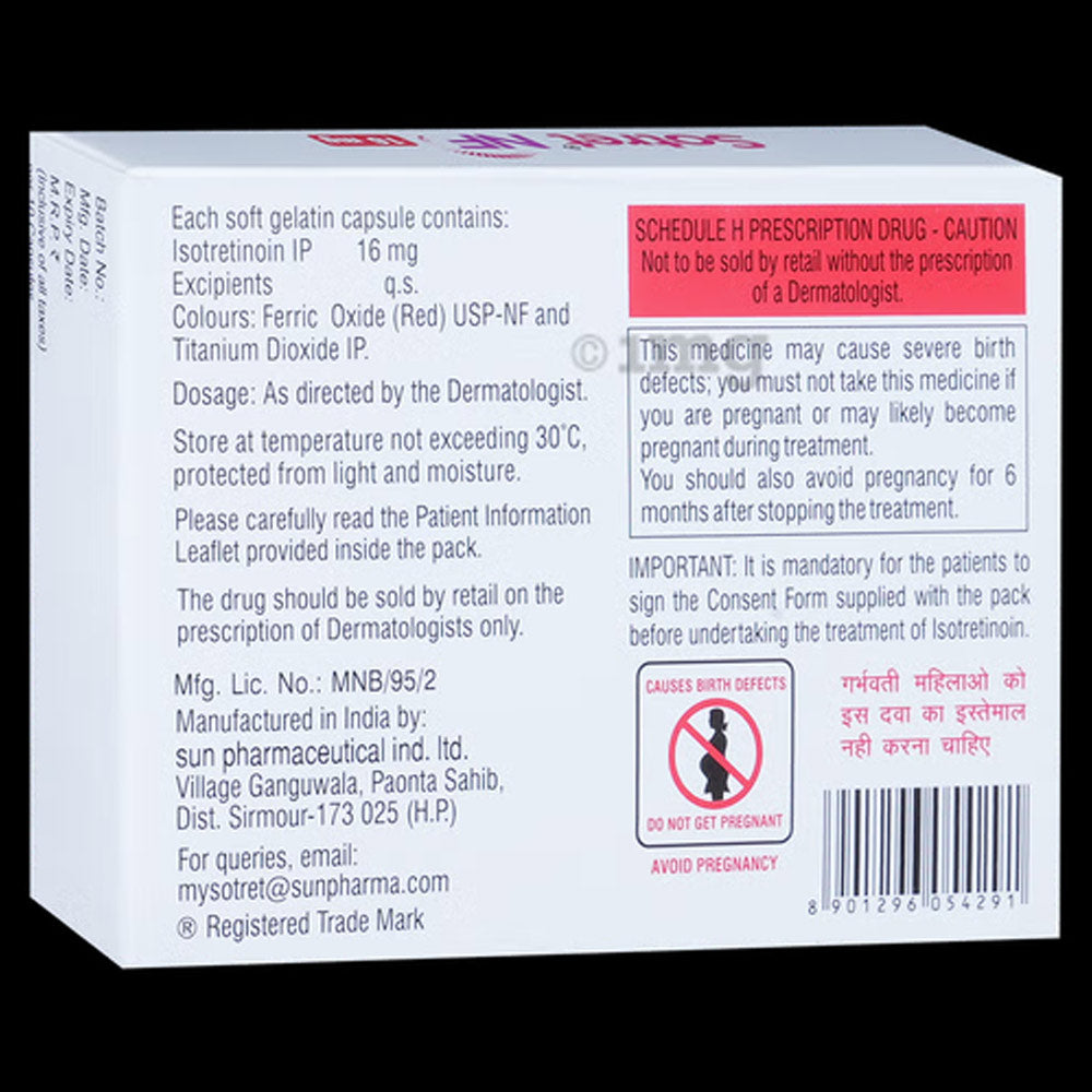 Sotret NF 16mg Capsule belongs to a group of medicines called retinoids (vitamin A derivative). It is used to treat severe acne that has not responded to other treatments.