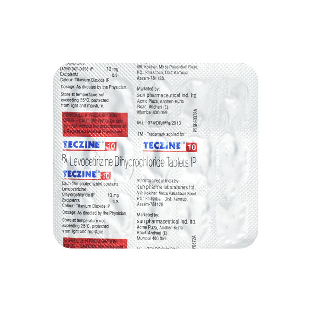 TECZINE 10MG TABLET is used in the management of signs and symptoms of allergic rhinitis (such as nasal congestion, itchy nose, repeated sneezing, and red, watery, and/or itchy eyes) and urticaria (an allergic skin condition causing reddish raised patches on the skin with severe itching).