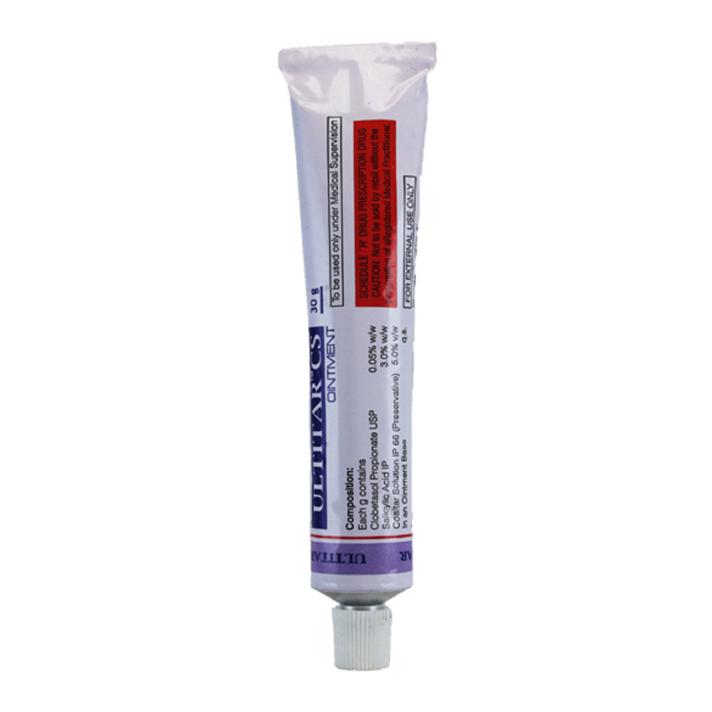 Ultitar Cs Ointment 30gm is used to treat eczema, psoriasis, and other inflammatory skin conditions. It combines clobetasol propionate, a potent steroid to reduce inflammation, and salicylic acid, a keratolytic agent to remove dead skin cells. This combination helps alleviate redness, itching, and scaling associated with these conditions.